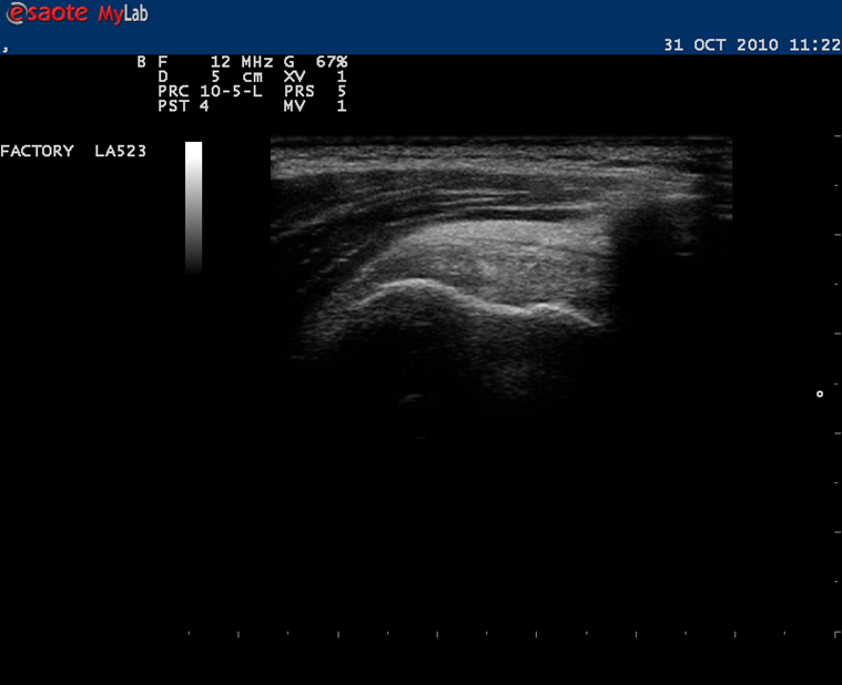 Obraz USG przestrzeni podbarkowej podczas techniki sonofeedback dla centrowania głowy k. ramiennej w zespołach cieśni podbarkowej